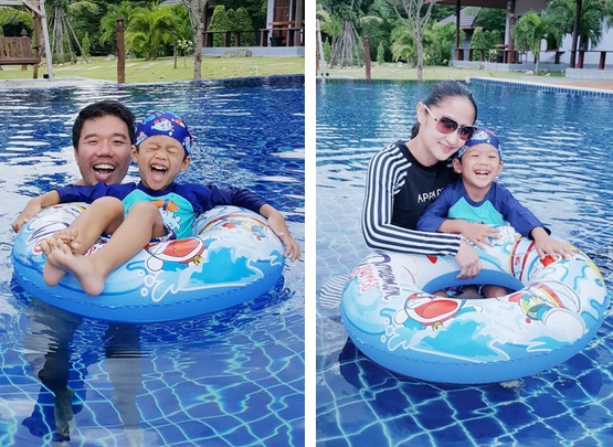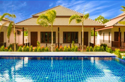 ห้องพักสไตล์บ้านแฝด ภายในตกแต่งสวยงามและทันสมัย พร้อมวิวทิวทัศน์ของสระว่ายน้ำและสวนหย่อม บรรยากาศส่วนตัวท่ามกลางความงามของภูเขาและแม่น้ำ